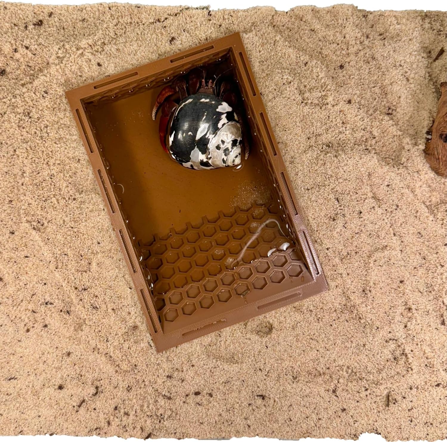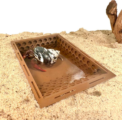 Introducing the Hermit Crab Hermit Crab In Ground Pool With Ramp! Hermit crabs use water to wet their gills and the inside of their shells. The Hermit Crab Pool With Ramp is the perfect depth to wet their gills without risk of drowning. A hermit crab pool is a necessary addition to any hermit crab habitat! The hexagonal design was made with hermit crab climbing in mind allowing for easy entry and exit of the pool to ensure hermit crabs do not get stuck. The in ground pool design makes it easy for hermit crabs to enter the pool without obstruction. Fill the pool to the perfect amount to fit your hermit crabs! This pool is large enough for most sizes of hermit crabs. While it is east to enter and exit it is reccommended to alter the water level to your hermit crabs needs. It is recommened that a hermit crab habitat has both a freshwater and a salt water pool. The Hermit Crab In Ground Pool With Ramp is made with safe plastic and will not cause harm to hermit crabs.